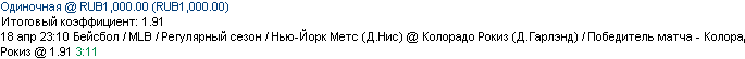 18/04 23:10 Нью-Йорк Метс (Д.Нис) @ Колорадо Рокиз (Д.Гарлэнд) / Победитель матча - Колорадо Рокиз @ 1.91 3:11 +++