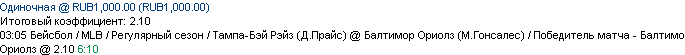 19/04 03:05 Тампа-Бэй Рэйз (Д.Прайс) @ Балтимор Ориолз (М.Гонсалес) / Победитель матча - Балтимор Ориолз @ 2.10 6:10 +++