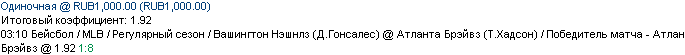 01/05 03:10 Вашингтон Нэшнлз (Д.Гонcалес) @ Атланта Брэйвз (Т.Хадсон) / Победитель матча - Атланта Брэйвз @ 1.92 1:8 +++