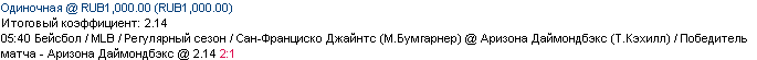 01/05 05:40 Сан-Франциско Джайнтс (М.Бумгарнер) @ Аризона Даймондбэкс (Т.Кэхилл) / Победитель матча - Аризона Даймондбэкс @ 2.14 2:1 ---