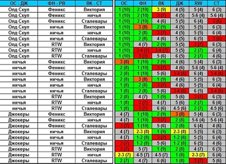 Впрочем, куда лучше всё видно в таблице раскладов в группе С. В левой половине указаны все 27 возможных исходов трёх заключительных матчей. В правой для каждой из команд (ОС - Олд Скул, ФН - Феникс, ВК - Виктория, ДЖ - Джокеры, RW - RTW, СТ - Сталевары) указаны места, которые они займут при том или ином результате (а в скобках - набранные при этом очки). Зелёным цветом выделены 100-процентно выходящие места (то есть 1-2), жёлтым - выходящие с высокой степенью вероятности, оранжевым - выходящие с низкой степенью вероятности, красным - с мизерной, лишь теоретически возможной степенью вероятности. Серый цвет - пролёт.