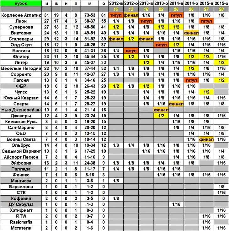 Начнём по традиции со сводной таблицы розыгрышей Кубков за всё время их существования. В ней, как видите, не заполненными остались всего две клеточки – напротив идущего вторым Лиона и здорово приподнявшейся Киевской Руси.