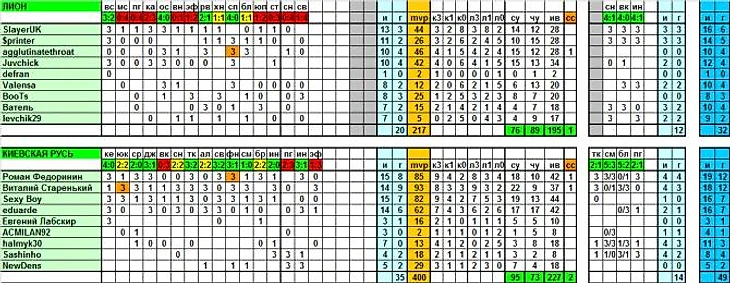 Ямато: Как нетрудно убедиться, КР по всем параметрам на голову выше будущего соперника. Командный балл MVP – ровно 400, один из самых высоких в лиге (больше только у Интера – 467, СТК – 466 и Мстителей – 459), тогда как Лион едва перевалил за 200. Примерно так же разнятся и индивидуальные показатели: у лидеров Руси под 90 баллов и выше, лучшие из «львов» не добрались даже до полтинника.