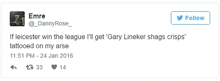 «Если «Лестер» выиграет лигу, я набью тату «Гари Линекер трахает чипсы» на заднице»