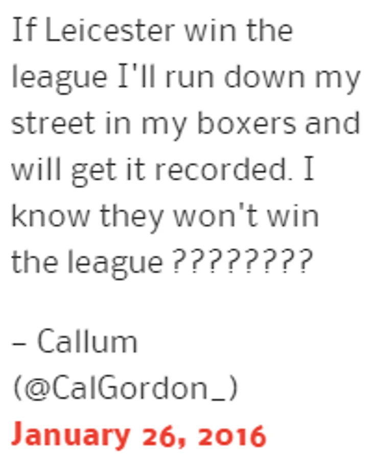 «Если Лестер выиграет лигу, я пробегу по своей улице в трусах и запишу это на видео. Я знаю, они ведь не станут чемпионами???»