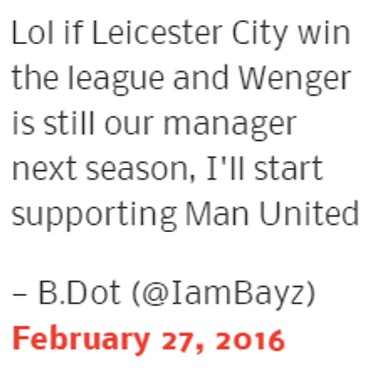 «Лол, если «Лестер» станет чемпионом и Венгер останется нашим менеджером на будущий сезон, я начну болеть за «Манчестер Юнайтед»