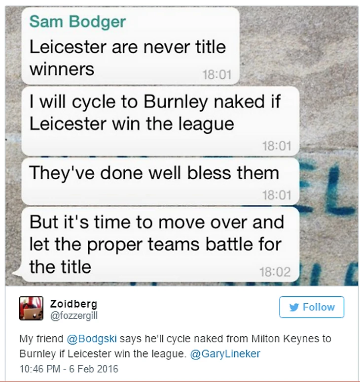 «Мой друг сказал, что поедет на велосипеде голым из Милтон Кейнс в Бернли, в случае если «Лестер» выиграет лигу»