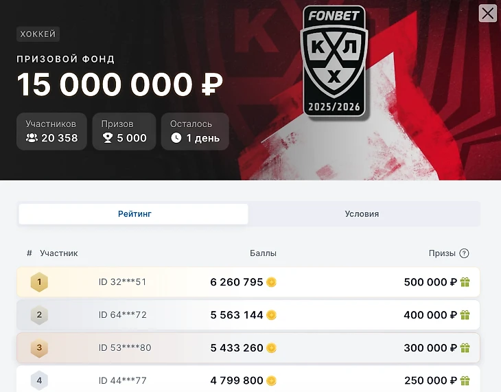 Пример бонусов: Досрочный расчет ставок на РПЛ в БК «Марафон», если ваш фаворит ведет в счете в 2 гола. Розыгрыш до 500 000 рублей фрибетами в БК «Фонбет» за ставки на матчи КХЛ и другие хоккейные турниры.