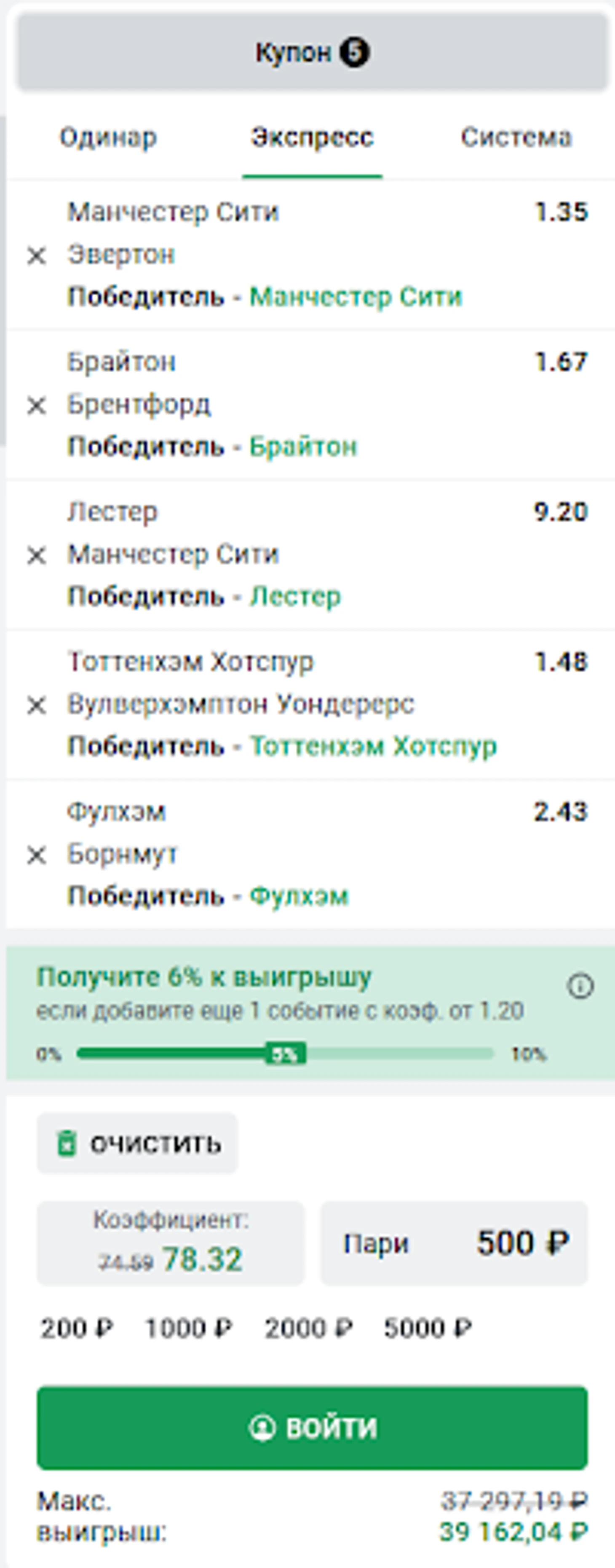 Акция подходит для тех клиентов, кто любит ставить экспрессы. Из плюсов можно выделить отсутствие ограничения по минимальной сумме, а также лояльное требование к минимальному коэффициенту — не ниже 1.20. Для получения бонуса 3-5% достаточно добавить в купон 3-5 исходов, что повышает шансы на итоговый выигрыш.