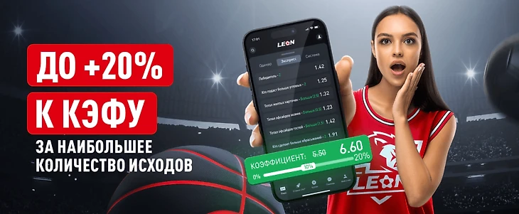 В букмекерской конторе «Леон» выгодно делать экспресс-ставки. За пари с тремя и более исходами вы можете получить дополнительный бонус до 20% к сумме выигрыша. Бонус начисляется только на успешные пари, при проигрыше или возврате бонус не начисляется.
