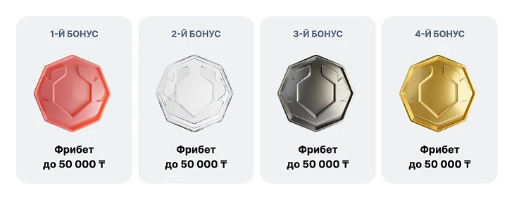 Бонус распределяется в равной пропорции. При максимальном размере вознаграждения 200 000 тенге, игрок получает четыре фрибета по 50 000. Если вы внесли первый депозит 100 000 тенге, то каждый фрибет будет равен 25 000 тенге.