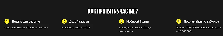 Для успешного участия и подъема в рейтинге нужно набирать баллы. Система их начисления проста, но эффективна: за каждую рассчитанную ставку-ординар на киберспорт с коэффициентом от 1.3 участник получает 1 000 условных баллов. Если же ставка была в формате «экспресс», то в зачет пойдет 500 баллов. Именно эти виртуальные очки и определяют позицию в общей таблице.