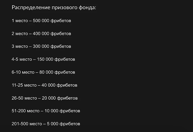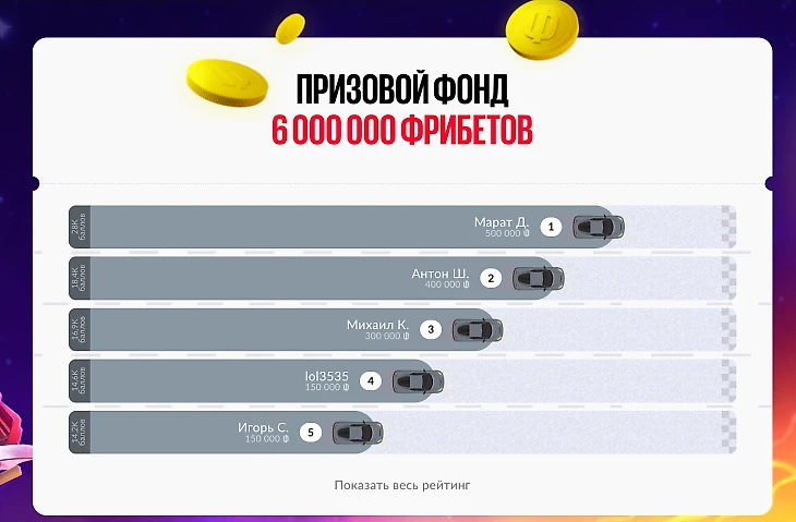 Огромный общий призовой фонд в 6 000 000 фрибетов, который получат пятьсот участников, что значительно увеличивает шансы на победу по сравнению с акциями, где призы достаются единицам.
