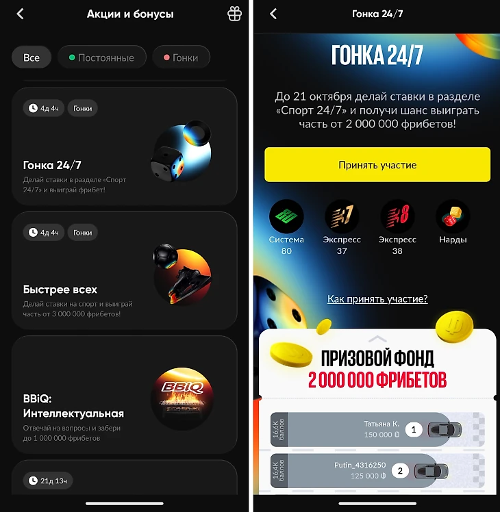 Акция «Гонка 24/7» от БК BetBoom предлагает участникам возможность выиграть фрибеты без ограничений в зависимости от суммы ставок. Каждый участник получает баллы за ставки, что позволяет ему подниматься вверх по турнирной таблице и бороться за ценные призы.