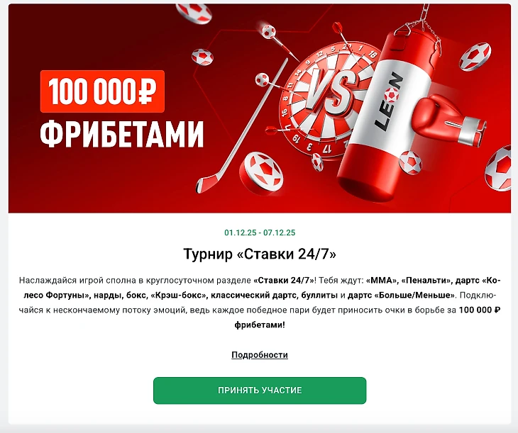 Букмекерская контора «Леон» предлагает всем своим клиентам принять участие в очередном Турнире «Ставки 24/7». Каждый участник может выиграть часть от призового фонда в 100 000 рублей фрибетами за пари в разделе «Ставки 24/7».