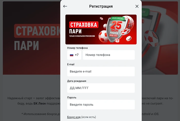 Условия участия просты. Акция доступна всем зарегистрированным клиентам «Леон». Необходимо авторизоваться на сайте или в мобильном приложении букмекера и на странице акции нажать кнопку ПРИНЯТЬ УЧАСТИЕ. Если у вас еще нет учетной записи в БК «Леон», то для ее создания достаточно будет заполнить простую анкету: