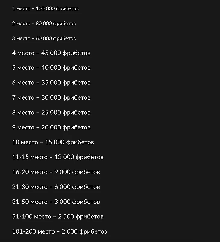 Призовыми считаются места с 1-го по 200-е в рейтинге. Топ-200 участников получат бонусы – фрибеты разного номинала в зависимости от занятого места. За первое место полагается максимальный фрибет номиналом 100 000 рублей, за высокие позиции в десятке лидеров – десятки тысяч рублей бонусами.