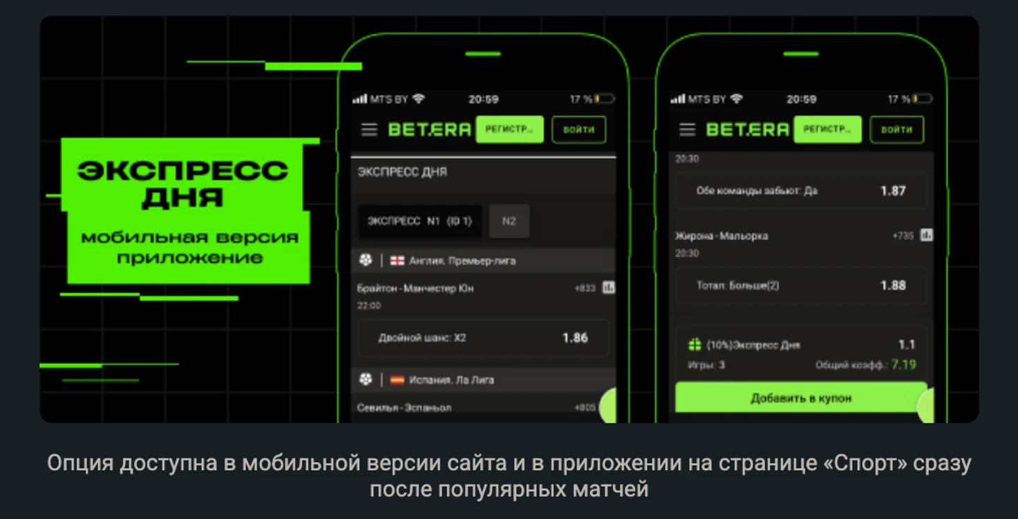 Участие в акции доступно всем зарегистрированным клиентам BETERA BY через сайт букмекера или официальные мобильные приложения для Android и iOS. Найти «Экспресс дня» можно в разделе «Спорт» – в десктопной версии он расположен в верхнем правом углу, а в мобильной версии или приложении – сразу после блока популярных матчей. Ключевое условие – ставка должна быть сделана только в прематче и строго до начала первого события в экспрессе.