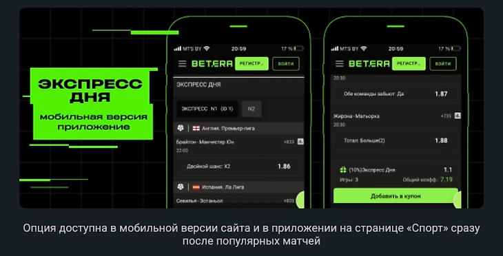 Участие в акции доступно всем зарегистрированным клиентам BETERA BY через сайт букмекера или официальные мобильные приложения для Android и iOS. Найти «Экспресс дня» можно в разделе «Спорт» – в десктопной версии он расположен в верхнем правом углу, а в мобильной версии или приложении – сразу после блока популярных матчей. Ключевое условие – ставка должна быть сделана только в прематче и строго до начала первого события в экспрессе.