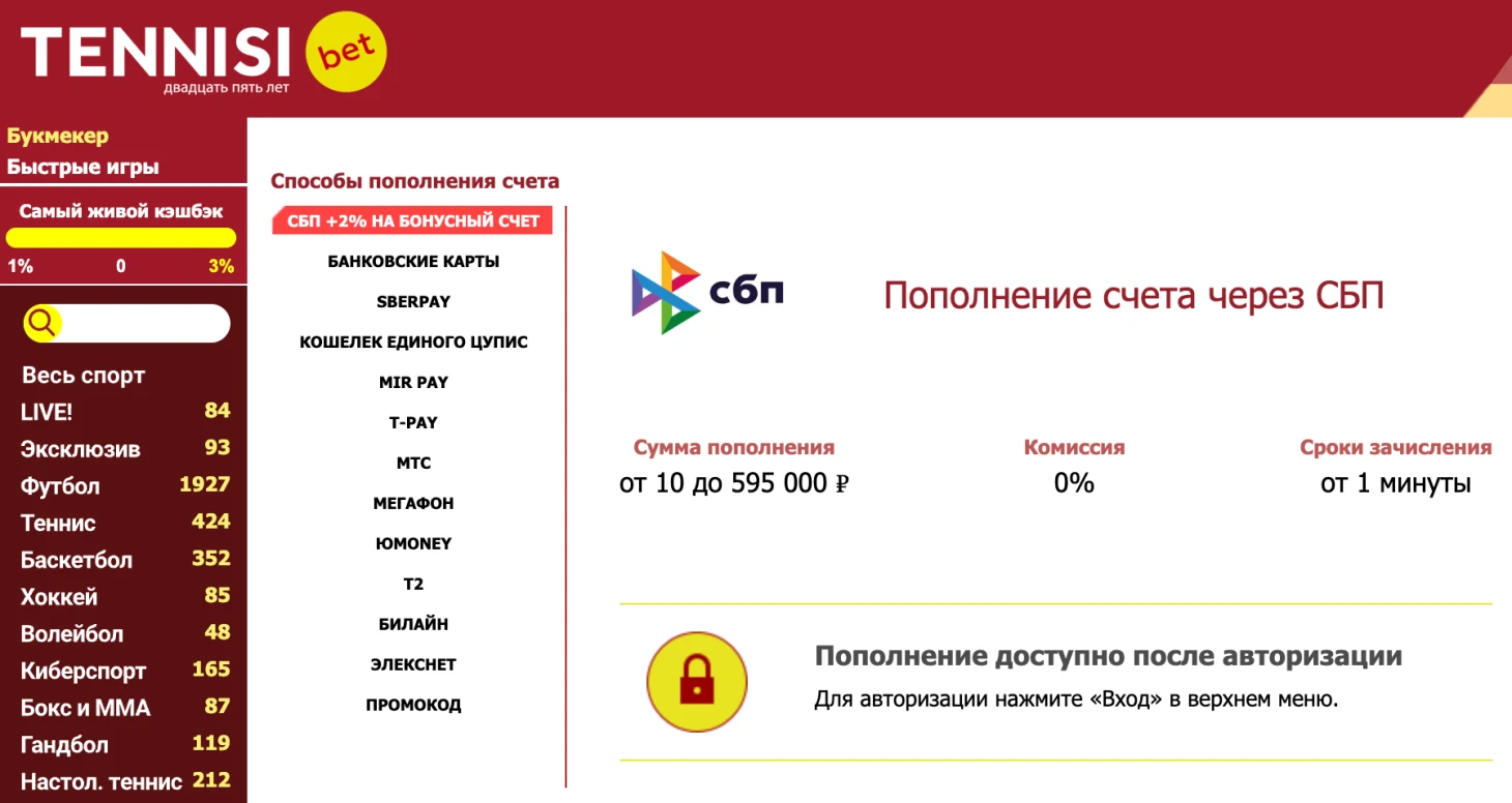 Букмекерская контора БК Tennisi предлагает выгодную акцию для своих пользователей – бонус 2% на депозит, сделанный через систему быстрых платежей (СБП). Это отличная возможность получить дополнительные средства на бонусный счет при пополнении баланса, а затем использовать их для ставок.