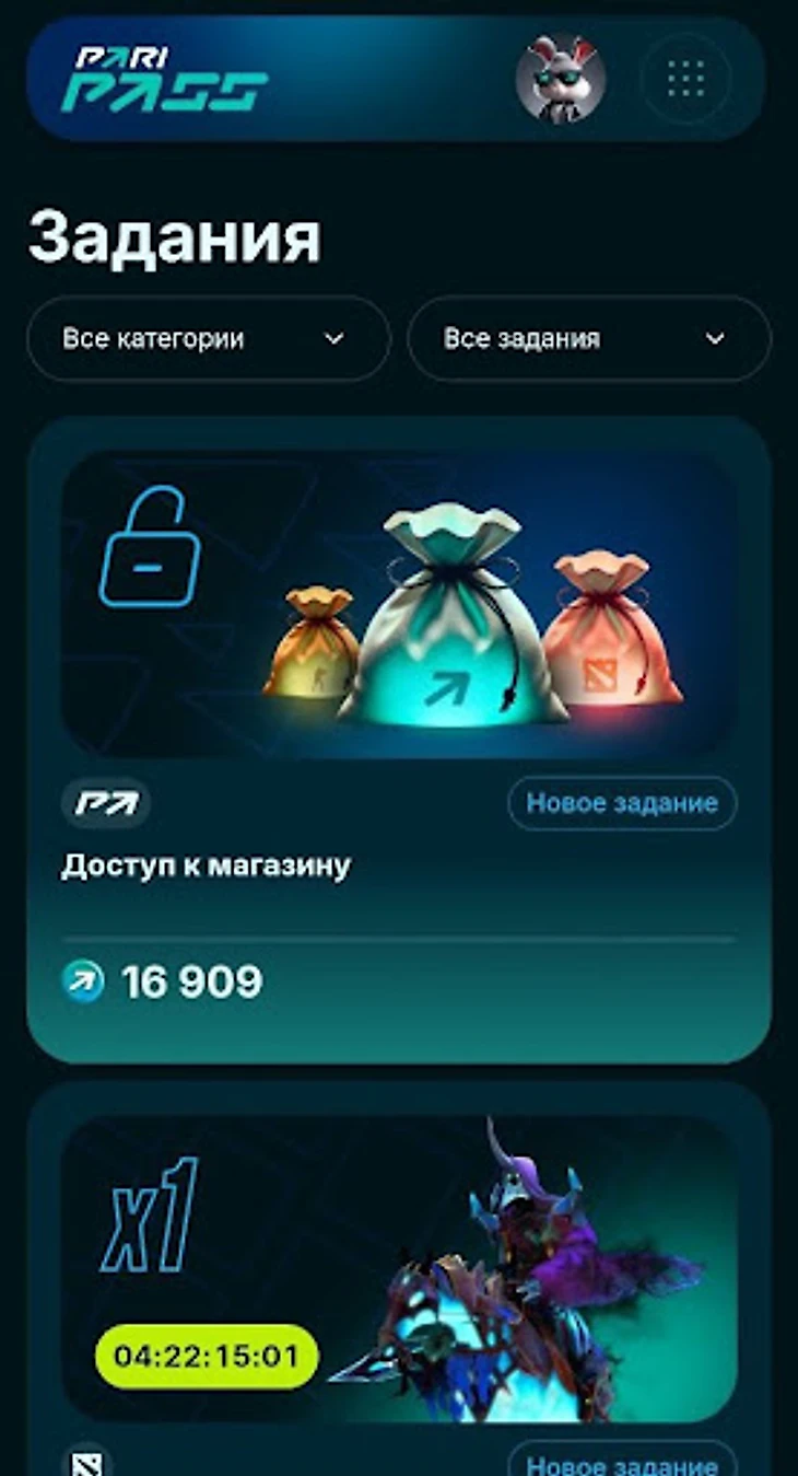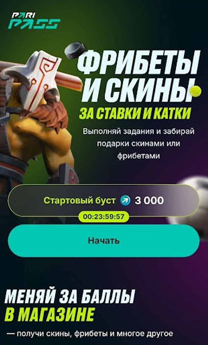 PARI PASS – это интерактивная платформа от БК PARI для любителей классического спорта и киберспорта. В нее входят задания, квесты и викторины, за выполнение которых пользователи получают фрибеты и скины.