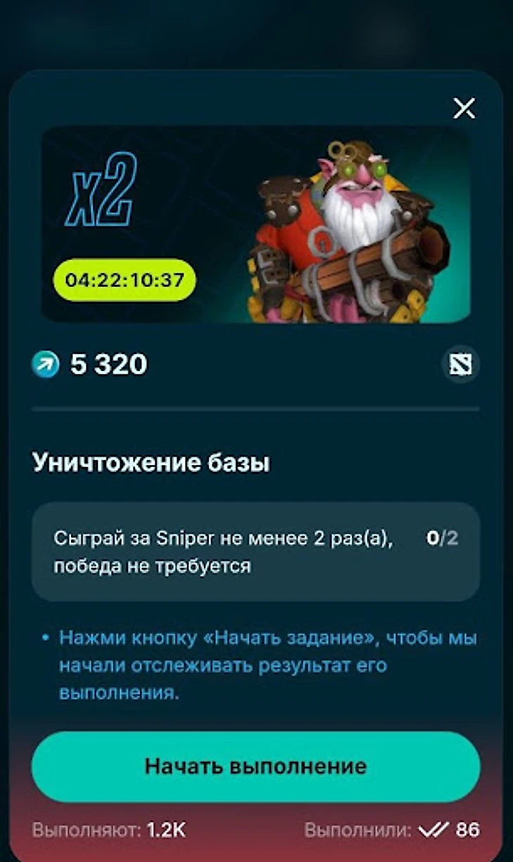 игровые задачи в Dota2 и CS2 – например, сделать определенное количество фрагов из указанного оружия.