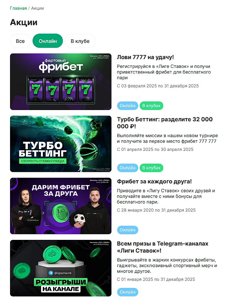 С полным списком бонусов можно ознакомиться на сайте букмекера Liga Stavok в разделе «Акции».