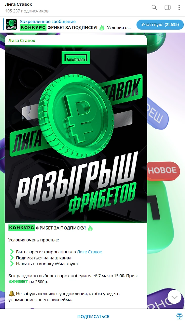 Конкурсы «Лига Ставок». Подписывайтесь на канал букмекера в Telegram. В нем регулярно проводится розыгрыш призов, спортивной атрибутики, гаджетов, фрибетов.