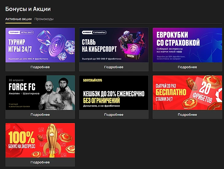 С полным списком бонусов можно ознакомиться на сайте БК в разделе «Акции».