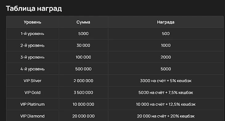 В рамках программы лояльности игроки получают реальные средства, если они достигли VIP-статуса. Размер бонуса от 3000 до 20 000 рублей. Для получения уровня VIP Silver требуется выполнение оборота ставок от 2 000 000 за один месяц. Полученное вознаграждение не требует отыгрыша, средства можно вывести сразу.
