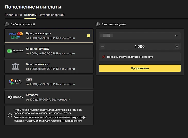 Фрибет 2500 рублей станет доступен после внесения депозита от 1000. Для перехода к пополнению счета игроку необходимо пройти идентификацию личности. Для этого потребуется заполнить анкету на сайте букмекера или подтвердить личность через Госуслуги, Сбер-ID, Т-ID. Если у вас уже есть подтвержденный аккаунт в Едином ЦУПИС, то идентификация будет пройдена автоматически. Пополнить баланс надо в течение 7 дней с момента регистрации.