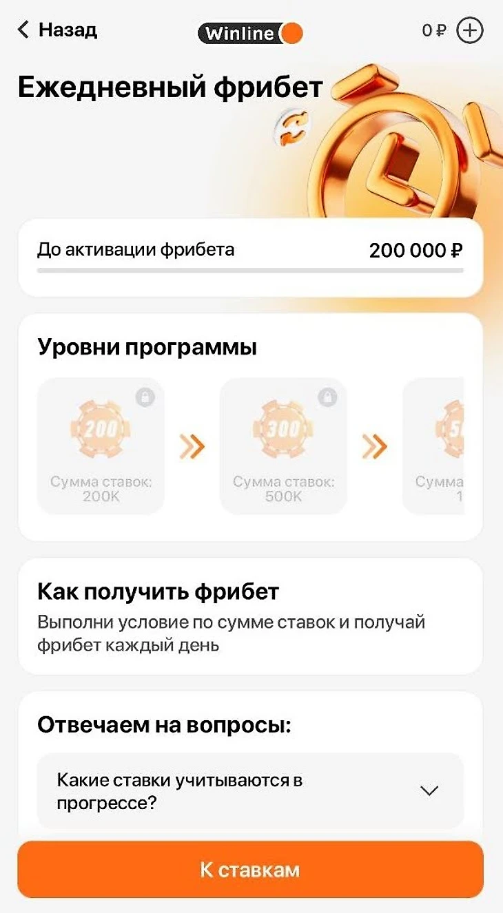 в рамках программы лояльности предусмотрены различные подарки за ставки и активность. Например, ежедневный фрибет: игрок выполняет условия по сумме ставок (с кф. не ниже 1.30) и забирает бесплатное пари. Чем больше денег потрачено на ставки, тем крупнее фрибет.