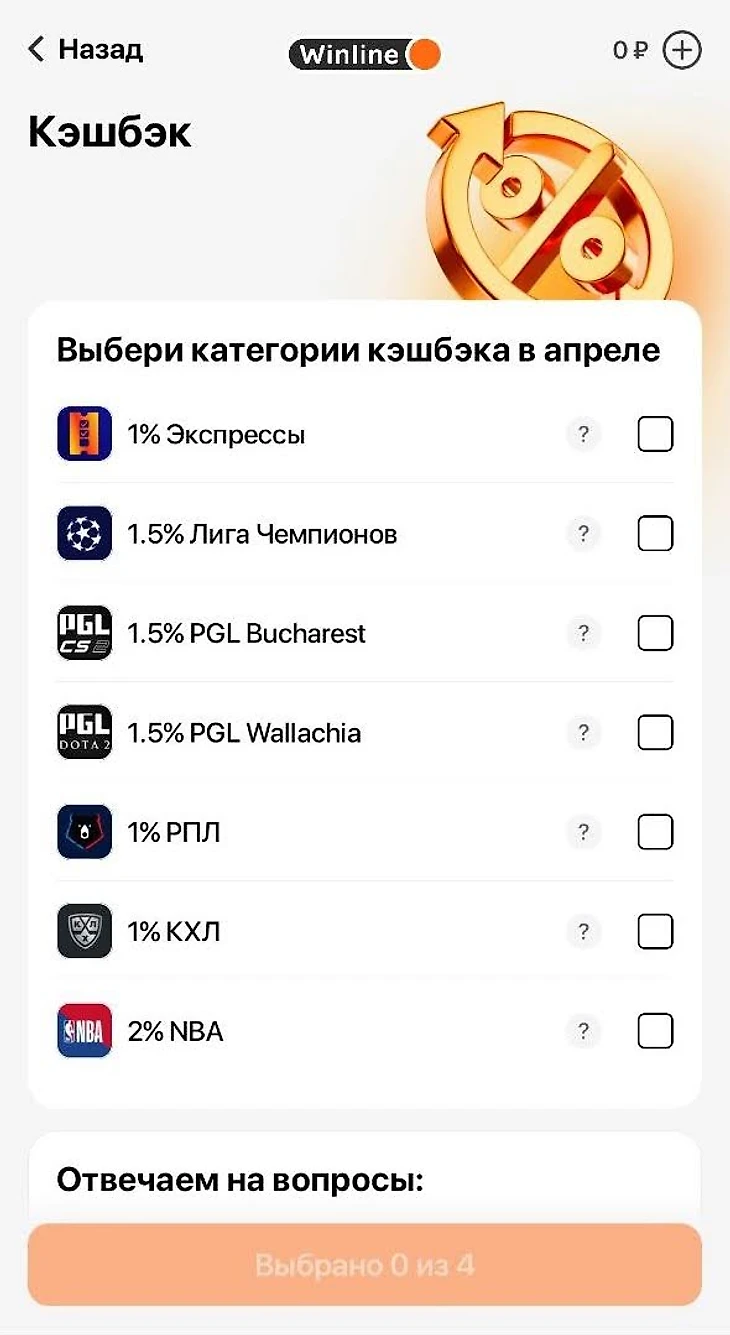 Кэшбэк. «Винлайн» начисляет кэшбэк по программе лояльности. Игрок выбирает категории кэшбэка (турниры и события) каждый месяц и получает возврат с каждой ставки.