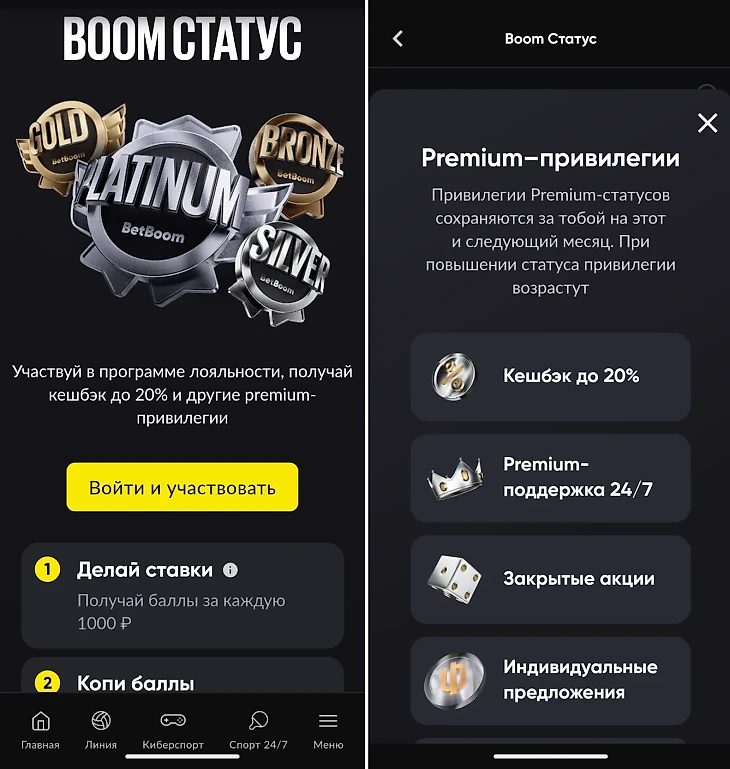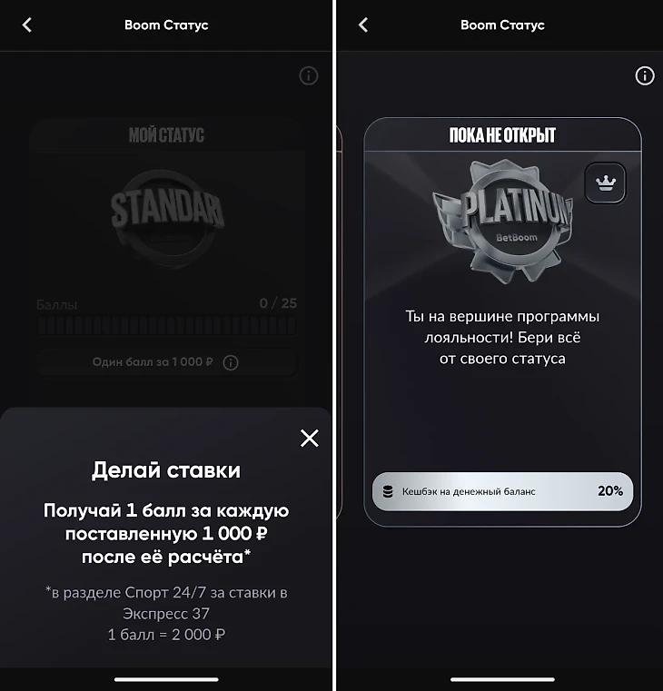Букмекерская контора BetBoom предлагает всем клиентам принять участие в программе лояльности «Boom Статус». Игроки получают различные бонусы и привилегии в зависимости от своего текущего статуса. Для повышения уровня в программе необходимо зарабатывать баллы за ставки. Участникам доступен кешбэк до 20%, а также дополнительные фрибеты за выполнение индивидуальных заданий, участие в закрытых мероприятиях и другие сюрпризы.