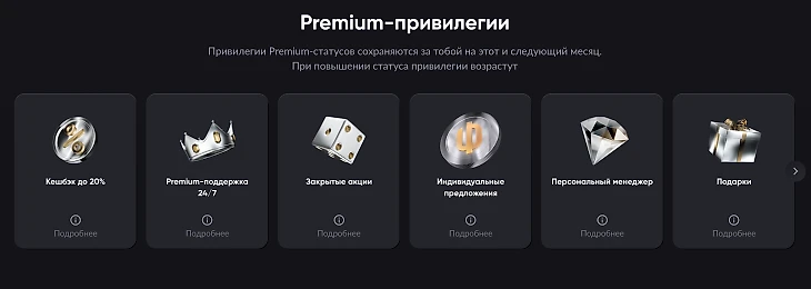 При достижении статуса Premium, оборот ставок не менее 25 000 000 рублей, игроки получают денежный бонус. Его не надо отыгрывать. Для остальных статусов бонус выплачивается фрибетом. Бесплатное пари можно поставить на события с коэффициентом от 1,05 до 3,50. В случае выигрыша игрок получает чистую прибыль — из выигрыша по пари вычитается сумма бонуса.