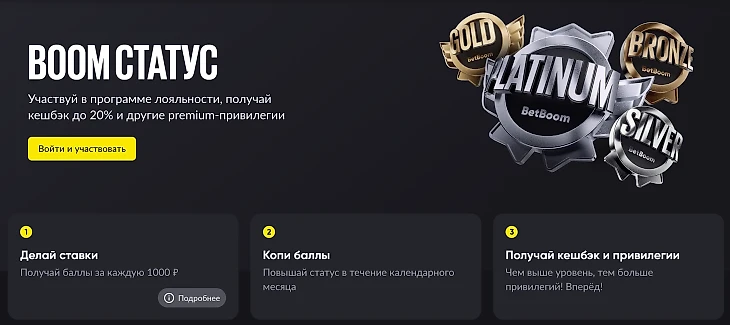 Букмекерская контора BetBoom предлагает всем клиентам принять участие в программе лояльности «Boom Статус». Для повышения уровня в программе необходимо зарабатывать баллы за ставки. В зависимости от уровня клиенты получают фрибеты или кешбэк реальными средствами.