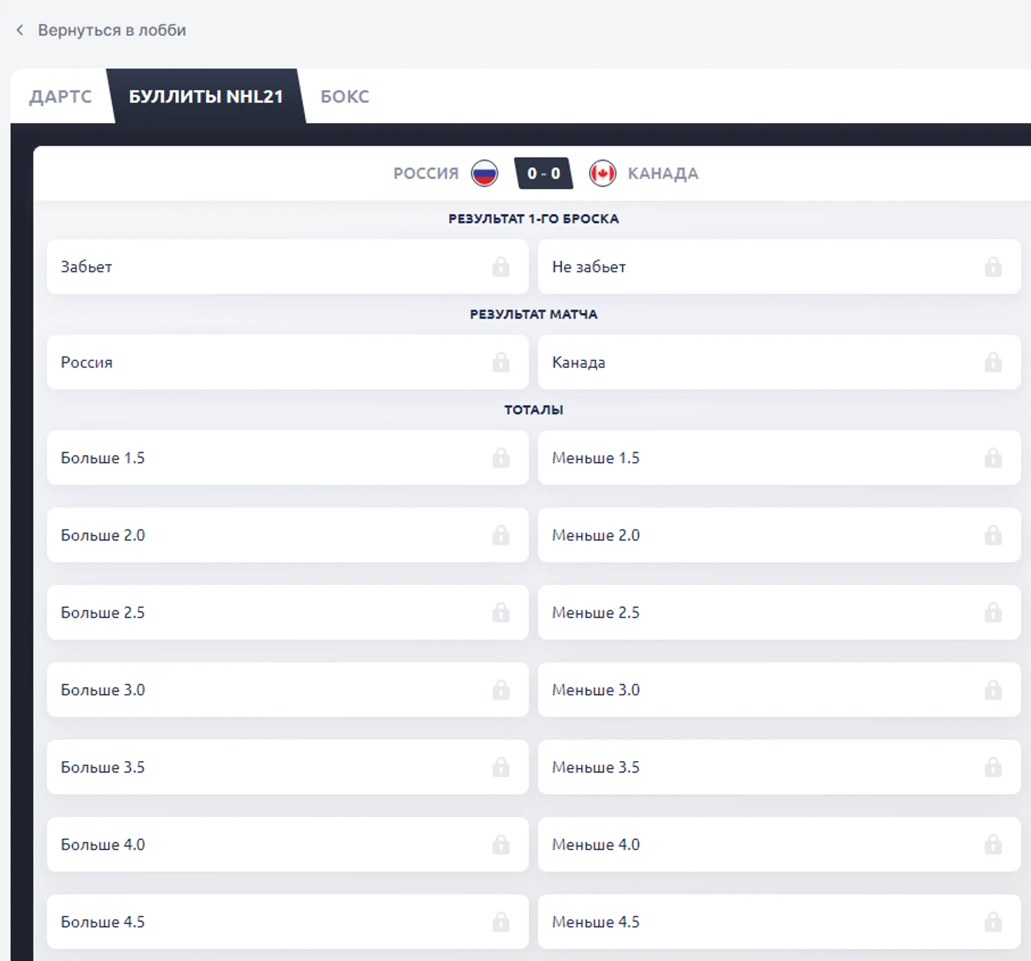 Буллиты NHL 21. Как и в NHL 24, киберспортсмены проводят серию буллитов, а игроку нужно лишь угадать победителя серии / тотал бросков / результат текущего броска.