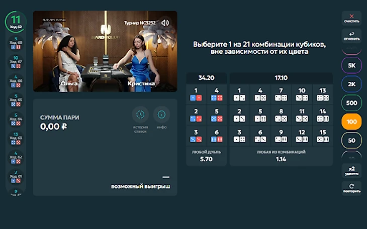 На игровом поле представлены 36 комбинаций кубиков. Задача игрока выбрать от 5 из них, которые не будут разыграны в раунде. Чем больше комбинаций игрок исключает, тем выше коэффициент.