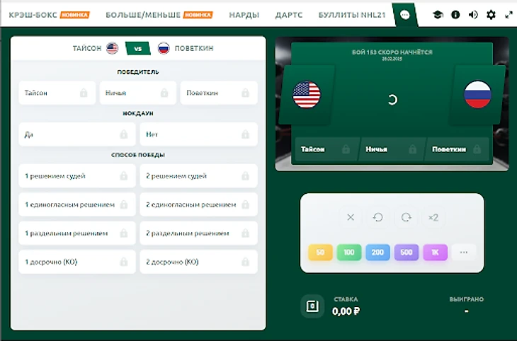 Котировки на победу спортсмена 1.35, на ничью и на силу удара свыше 400 — 100.