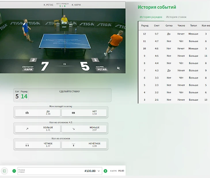 На странице игры ведется прямая трансляция матча. В отдельном окне можно изучить статистику раундов: точное количество отскоков, была ли сетка и чет/нечет.
