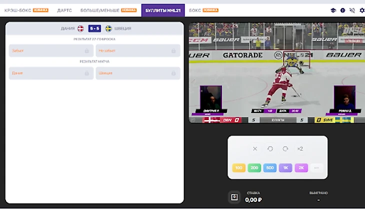 Суть игры — определить победителя серии послематчевых буллитов в игре NHL21. В специальной студии соревнуются два спортсмена, которые по очереди совершают попытки реализовать буллит.