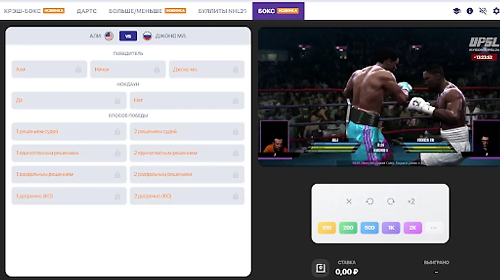 Беттер может поставить на результат поединка и на итоги каждого удара. На победу коэффициент 1.35, на ничью или силу удара большее 400, коэффициент 100.