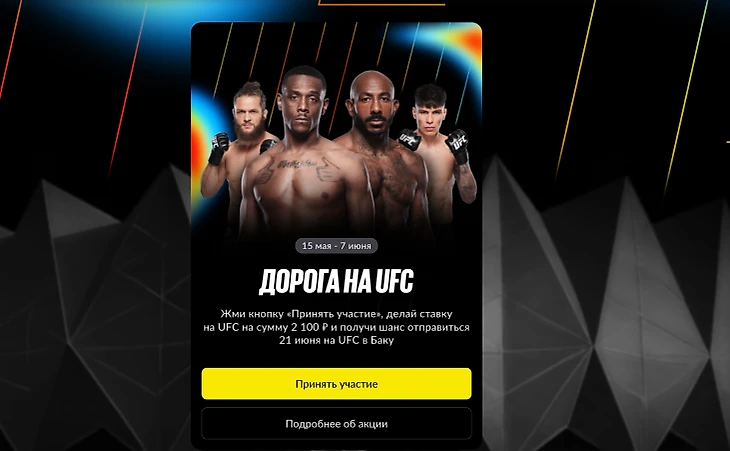 Главный приз – поездка на турнир UFC в Баку 21 июня. Остальные победители получат фрибеты номиналом от 1 000 до 100 000 рублей. Чем больше ставок вы сделаете, тем выше вероятность войти в число счастливчиков!