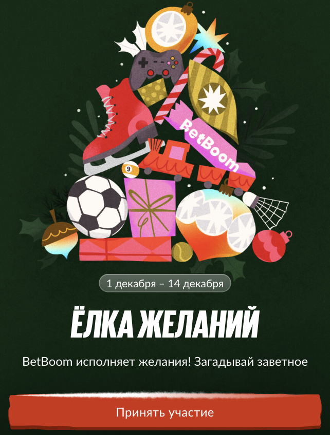 Акция «Елка желаний» проходит с 1 по 14 декабря 2025 включительно. В этот период любой зарегистрированный клиент BetBoom может оставить свое новогоднее желание. Итоги будут подведены 24 декабря 2025 в 19:00 по московскому времени в рамках финального розыгрыша.