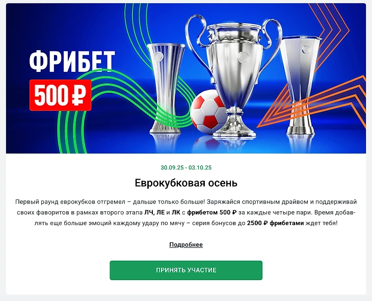 С 4 по 7 ноября 2025 БК «Леон» проводит новый этап акции «Еврокубковая осень», приуроченный к матчам Лиги чемпионов, Лиги Европы и Лиги конференций. За каждые четыре ставки (ординар или экспресс) на матчи ЛЧ, ЛЕ и ЛК по 500 рублей с коэффициентом не ниже 1.70 участник получает фрибет 500 рублей.