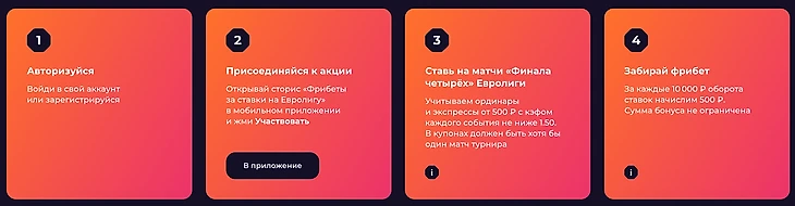 Минимальная сумма ставки составляет 500 рублей. При достижении оборота пари на Финал Четырёх Евролиги в 10 000 рублей, игрок автоматически получает фрибет 500 рублей. Количество бесплатных ставок не ограничено, фрибет выплачивается за каждые 10 000 рублей в ставках.