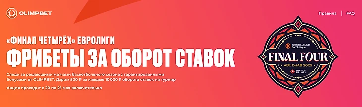 С 23 по 25 мая в Абу-Даби, ОАЭ, пройдет финал баскетбольной Евролиги 2024/2025. На «Этихад Арене» за трофей поборются «Фенербахче», «Панатинаикос», «Олимпиакос», «Монако». Полуфиналы пройдут 23 мая, а финалы 25. К старту «Финала четырех» Евролиги букмекер «Олимпбет» запустил акцию – фиксированные фрибеты 500 за каждые 10 000 рублей ставок.