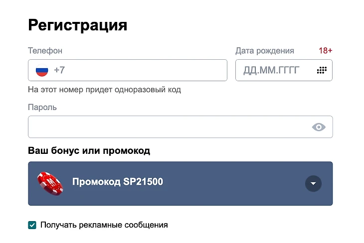 Принять участие в акции «Эксклюзивный фрибет до 21 500 рублей» могут только новые пользователи БК «Марафон». Необходимо зарегистрироваться на официальном сайте или в мобильном приложении букмекера, обязательно указав промокод SP21500 при регистрации или первом депозите.