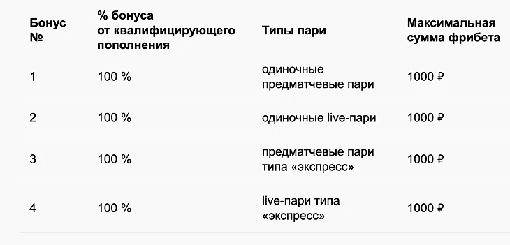 Всего доступно 4 фрибета по 1 000 рублей (максимальная сумма бонуса — 4 000 рублей. Хотите забрать максимальный бонус – каждый раз вносите на аккаунт минимум 1 000 рублей.