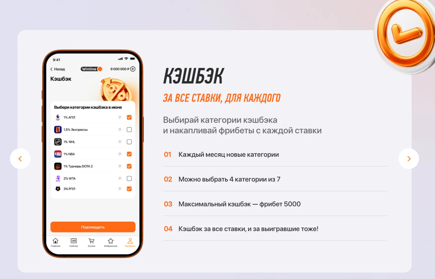 В рамках бонусной программы лояльности WINLINE PRIORITY игроки могут получать кэшбэк за каждую ставку. В начале месяца клиент выбирает любимые категории и в новом забирает фрибет до 5 000. Программа похожа на те, которые предлагают банки, но вместо аптек и магазинов, игрок выбирает турниры.